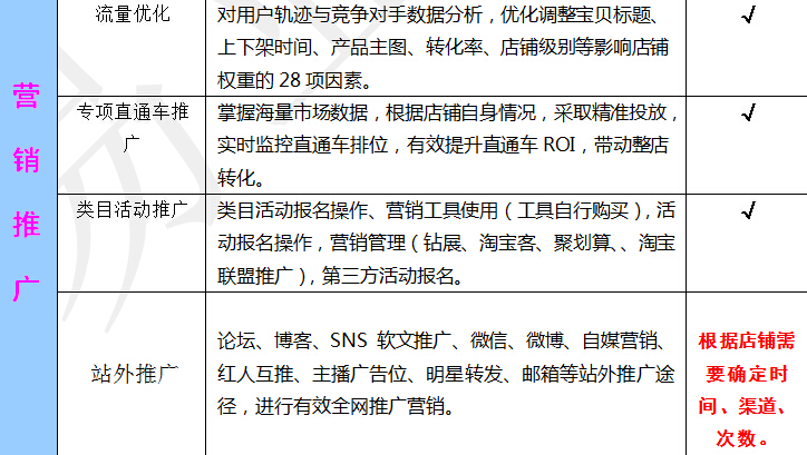 店铺也有了,装修也做好了,剩下该干什么了?当然是让大家知道你开店了,坐等客从天上来的事情是不存在的,所以实体店开门还要搞个剪彩仪式,敲锣打鼓摆招牌,网店竞争对手那么多就更要打广告宣传店铺了。广告怎么打?运营呗,直通车、活动、站外推广等等,都是必不可少的。第三项服务内容:营销推广