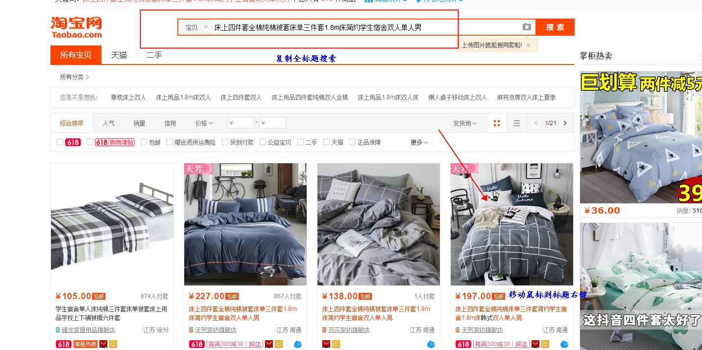 同样我们搜索四件套(大词)出现在前面的宝贝都是月销量上万,几千的宝贝,那么如果我们的宝贝标题用的都是大词,而且我们的宝贝基础权重很低,可想而知会排到多少页。所以在新品前期宁愿放弃搜索热度很高的词也要找到一些适合宝贝当下能够快速获得展现的蓝海词,才可以快速的突破。